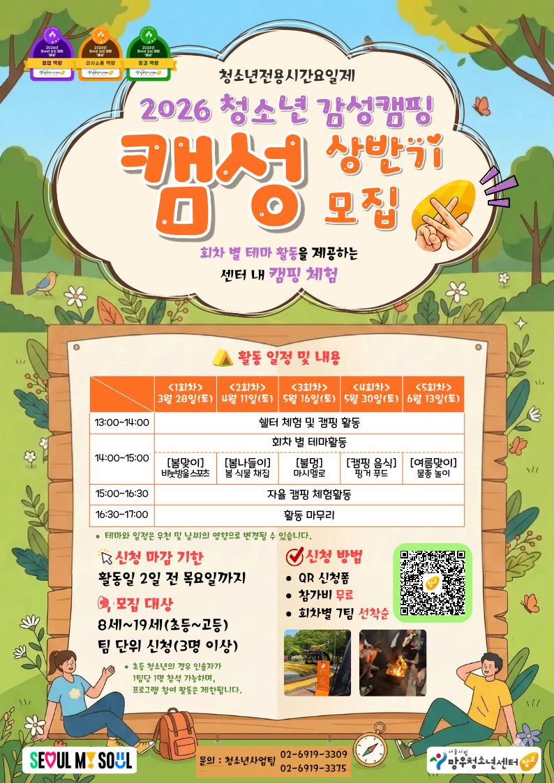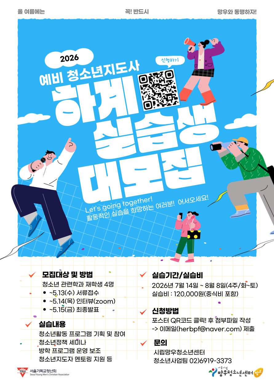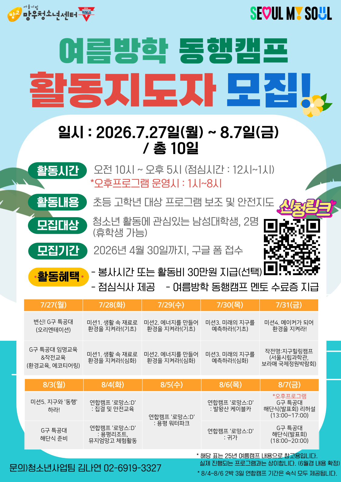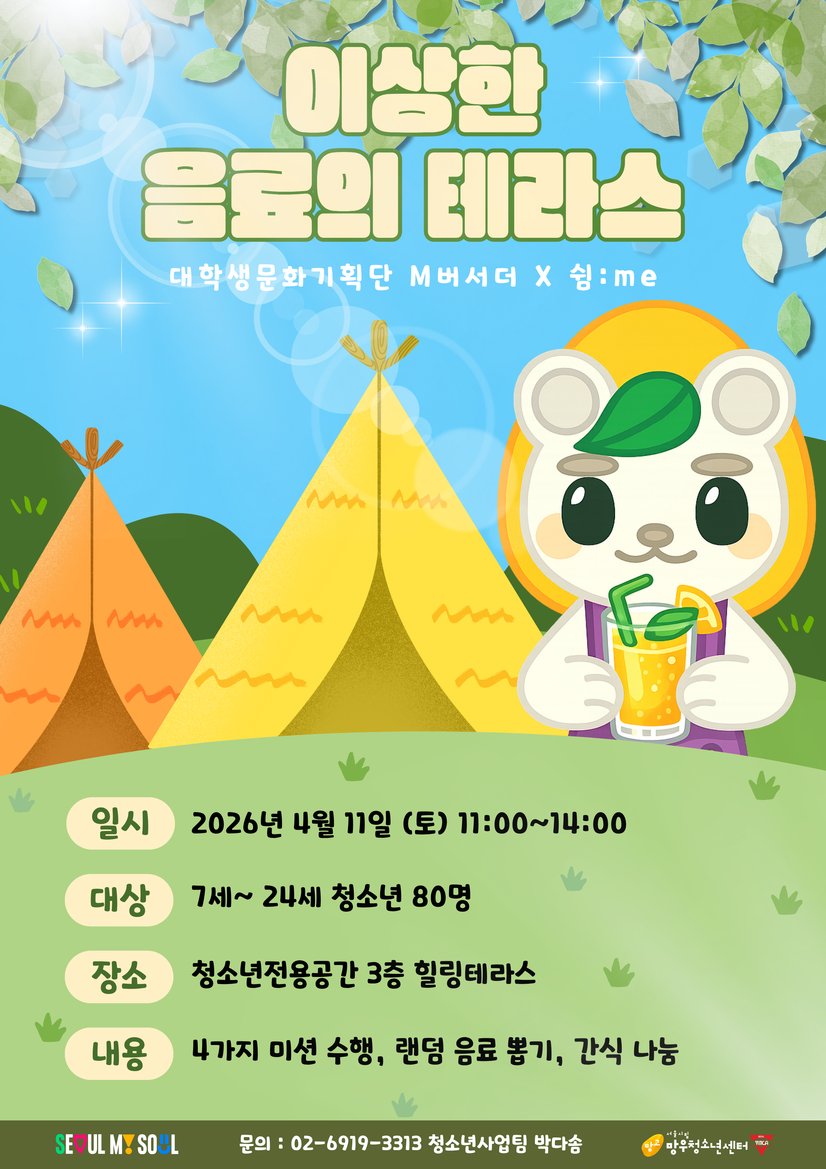 망우청소년센터에서 다양한 프로그램 안내 및 신청정보입니다.- 채용서울시립망우청소년센터 교육문화 정규강사 채용(과학, 글쓰기)26.04.24