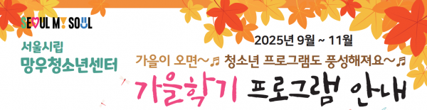 목록 2025 가을학기(9월~11월) 프로그램지(PDF참고) 페이지 정보 작성자 mangwoo 댓글 0건 조회 631회 작성일 25-08-29 14:12 본문 . 첨부파일 가을학기 프로그램지.pdf (1.0M) 193회 다운로드 | DATE : 2025-08-29 14:16:45 이전글2025년 '이달의 망고' 9월호 발간 25.09.03 다음글2025년 '이달의 망고' 8월호 발간 25.08.05 댓글 0 댓글목록 등록된 댓글이 없습니다. 목록