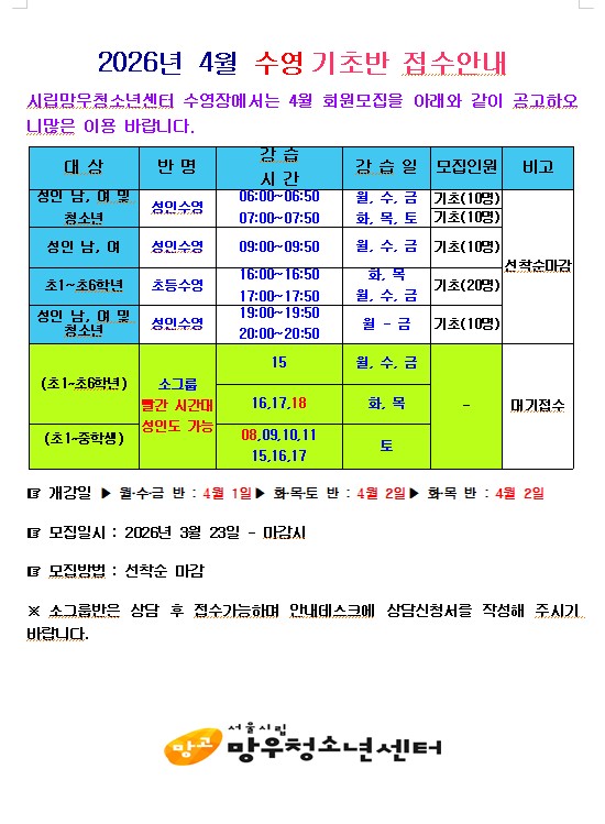 목록 [공지] 2026년 4월 수영 기초반 접수안내 페이지 정보 작성자 시립망우청소년센터 댓글 0건 조회 145회 작성일 2026-03-17 본문 감사합니다.^^ 추천0 이전글[교육문화]원어민강좌 교재안내(3월-2차) 26.03.18 다음글시립망우청소년센터 직원(방과후아카데미/헬스지도자) 채용 서류전형 합격자 공고 26.03.16 댓글 0 댓글목록 등록된 댓글이 없습니다. 목록