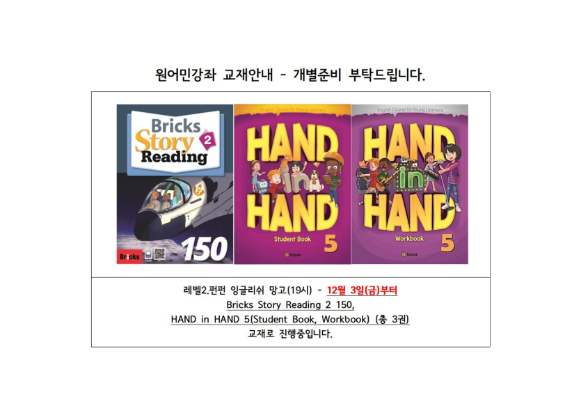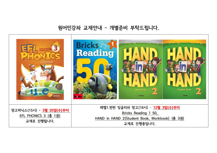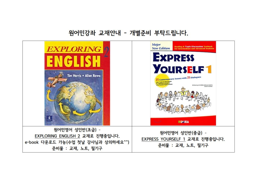 목록 [체육·문화] [교육문화]원어민강좌 교재안내(3월-2차) 페이지 정보 작성자 시립망우청소년센터 댓글 0건 조회 42회 작성일 2026-03-18 본문 . 추천0 이전글시립망우청소년센터 직원 채용 최종 합격자 공고 26.03.18 다음글2026년 4월 수영 기초반 접수안내 26.03.17 댓글 0 댓글목록 등록된 댓글이 없습니다. 목록