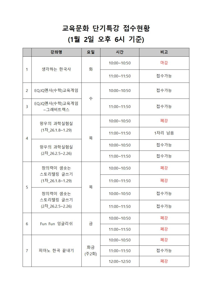 [체육·문화] [교육문화]겨울방학 단기특강 폐강안내