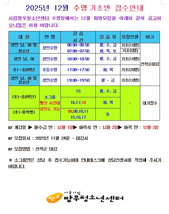 목록 [공지] 2025년 12월 수영 기초반 접수안내 페이지 정보 작성자 시립망우청소년센터 댓글 0건 조회 824회 작성일 2025-11-14 본문 감사합니다. 추천0 이전글2026학년도 망우아기스포츠단 단원모집(5~7세) 25.11.17 다음글[교육문화]원어민강좌 교재안내(12월) 25.11.05 댓글 0 댓글목록 등록된 댓글이 없습니다. 목록