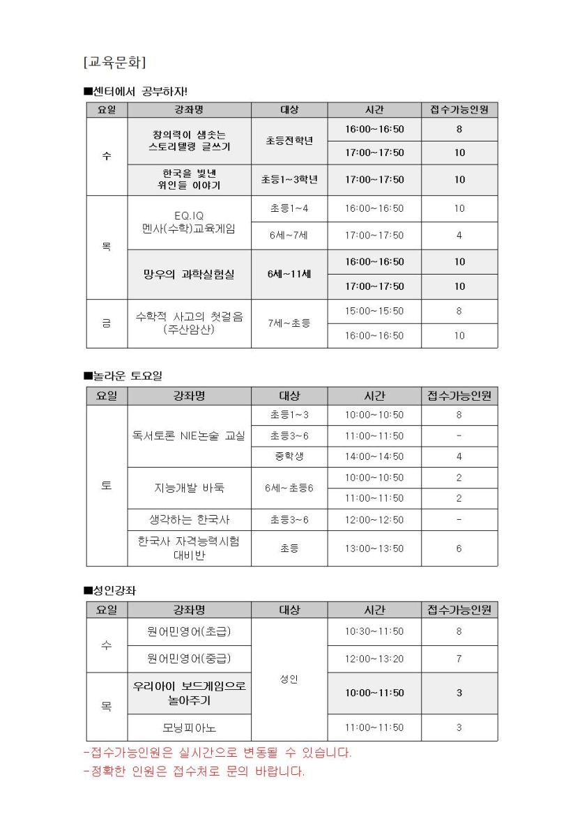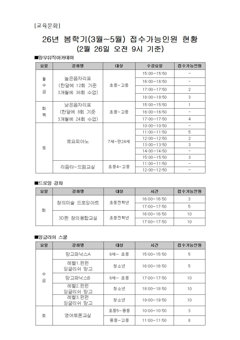 [체육·문화] [교육문화]봄학기(3월~5월) 접수현황 수정(2월 26일 오전9시 기준)