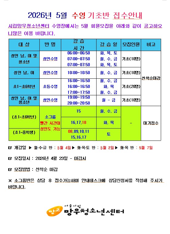 목록 [체육·문화] 2026년 5월 수영 기초반 접수안내 페이지 정보 작성자 시립망우청소년센터 댓글 0건 조회 167회 작성일 2026-04-20 본문 감사합니다. 추천0 이전글시립망우청소년센터 5월 휴관 안내 26.04.23 다음글[채용] 서울시립망우청소년센터 생활체육팀(토요일 오후 )수영강사 채용 공고 26.04.09 댓글 0 댓글목록 등록된 댓글이 없습니다. 목록